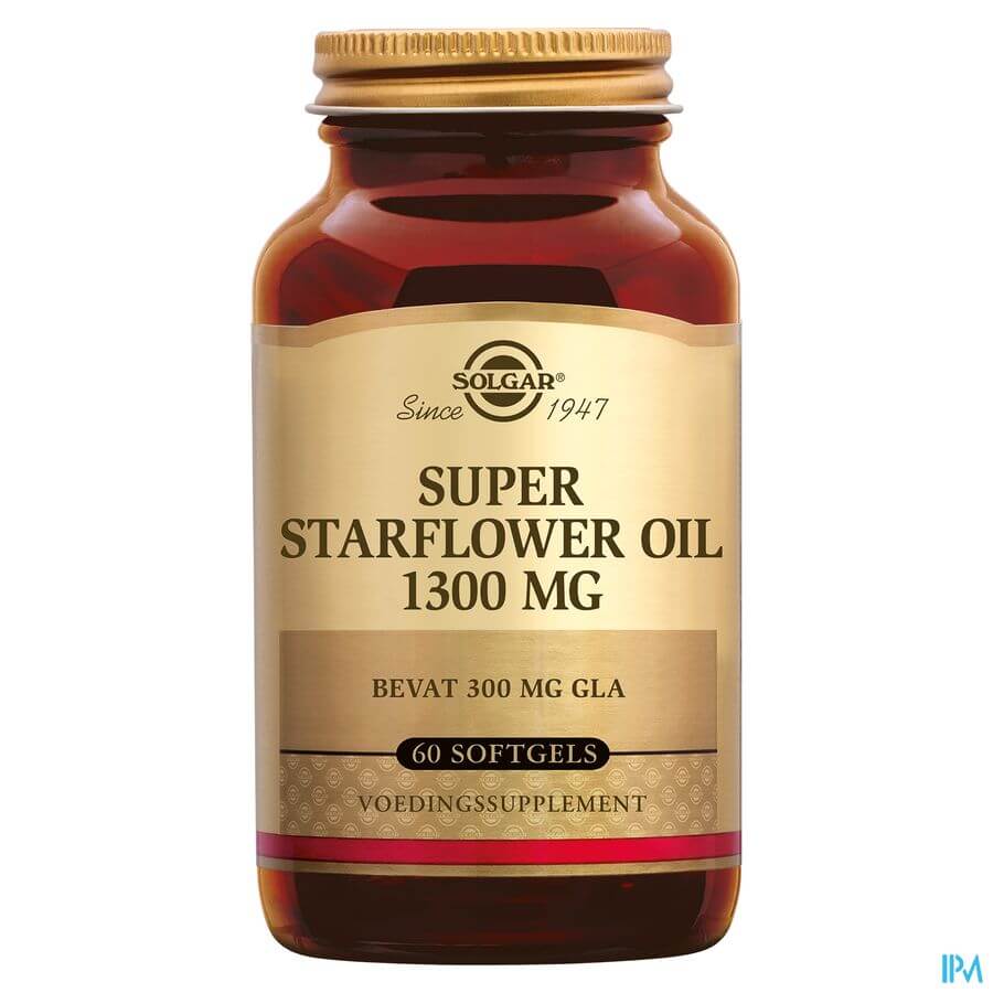 Solgar Super Starflower Oil 1300 mg (Borage) contient 300 mg d'AGL (un acide gras oméga-6) de l'huile de bourrache par softgel.