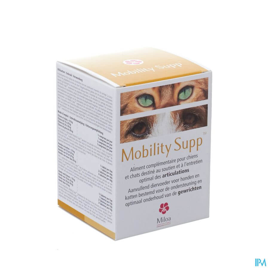 Il est recommandé d'utiliser Mobility Supp™ pendant au moins un mois. La quantité de Mobility Supp™ peut varier en fonction des besoins de votre animal. Miloa Mobility Supp™ convient à une utilisation continue. Les comprimés sont très appétissants. La plupart des chats et des chiens les avalent sans problème, mais ils peuvent également être écrasés et mélangés à la nourriture.
